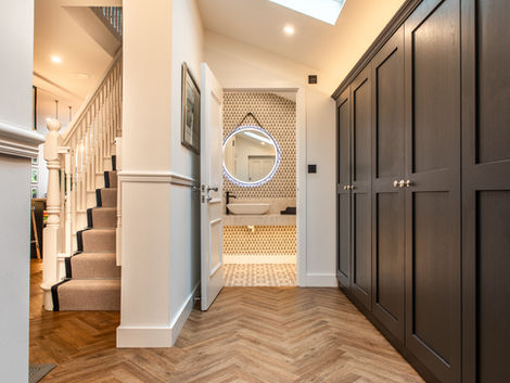 We built a single-storey side extension, adding a new front entrance, boot room, and kitchen utility at the rear. A double-storey rear extension was constructed to expand the living space and provide more room for the master bedroom. We also extended the other side of the house to increase space on both the ground and first floors. To further maximise the property’s potential, we added a dormer loft conversion, turning the house from a 3-bed to a 4-bed with a luxurious guest suite. The property was modernised with a new internal layout, new windows and doors, combining contemporary aluminium sliders with traditional timber frames, and a full underfloor heating system. We introduced a garden room to enhance the outdoor space and designed the interior to blend traditional and modern elements, including herringbone wooden flooring. The master bedroom was transformed with a panoramic window, offering views of the garden.